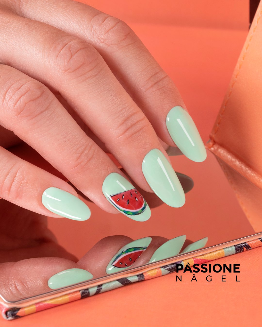 Wahrscheinlich erinnerst du dich an den Sommerspruch "Watermelon Sugar" von Harry Styles, den wir monatelang unter dem Sonnenschirm mitgesungen haben und der unser Verlangen nach Wassermelonen noch verstärkt hat. Vielleicht liegt es an ihrer Frische und Farbe, aber diese Frucht ist ein echtes Sommersymbol. Sie ist nicht nur bequem und praktisch zu essen, sondern auch der Star von Picknicks und Maniküren, wobei die Wassermelonennägel zu den häufigsten am Strand (und darüber hinaus) gehören. Wir schlagen sie auf einer Minzbase vor, für einen Look, der so frisch ist wie Sommerabende am Meer.
