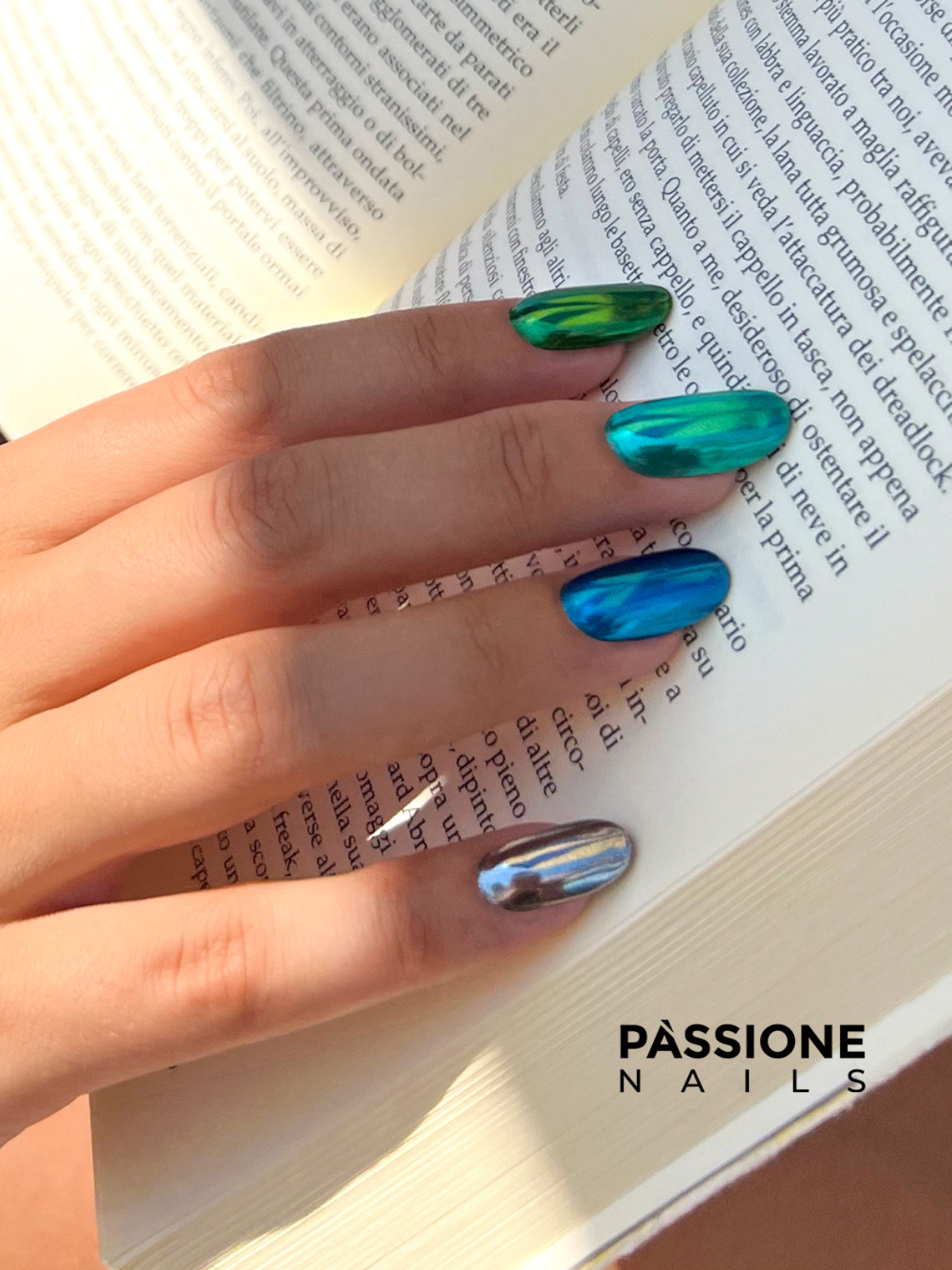 At PassioneNails we did a first coat of black and cured it, then we applied ultra gloss and polymerised this second layer as well. The third step was the fun one: we spread the chrome pigments on the nail bed silicone brush and then removed the excess powder with fan brush and finally polymerised everything. We sealed the nail design by spreading and curing the ultra gloss.
