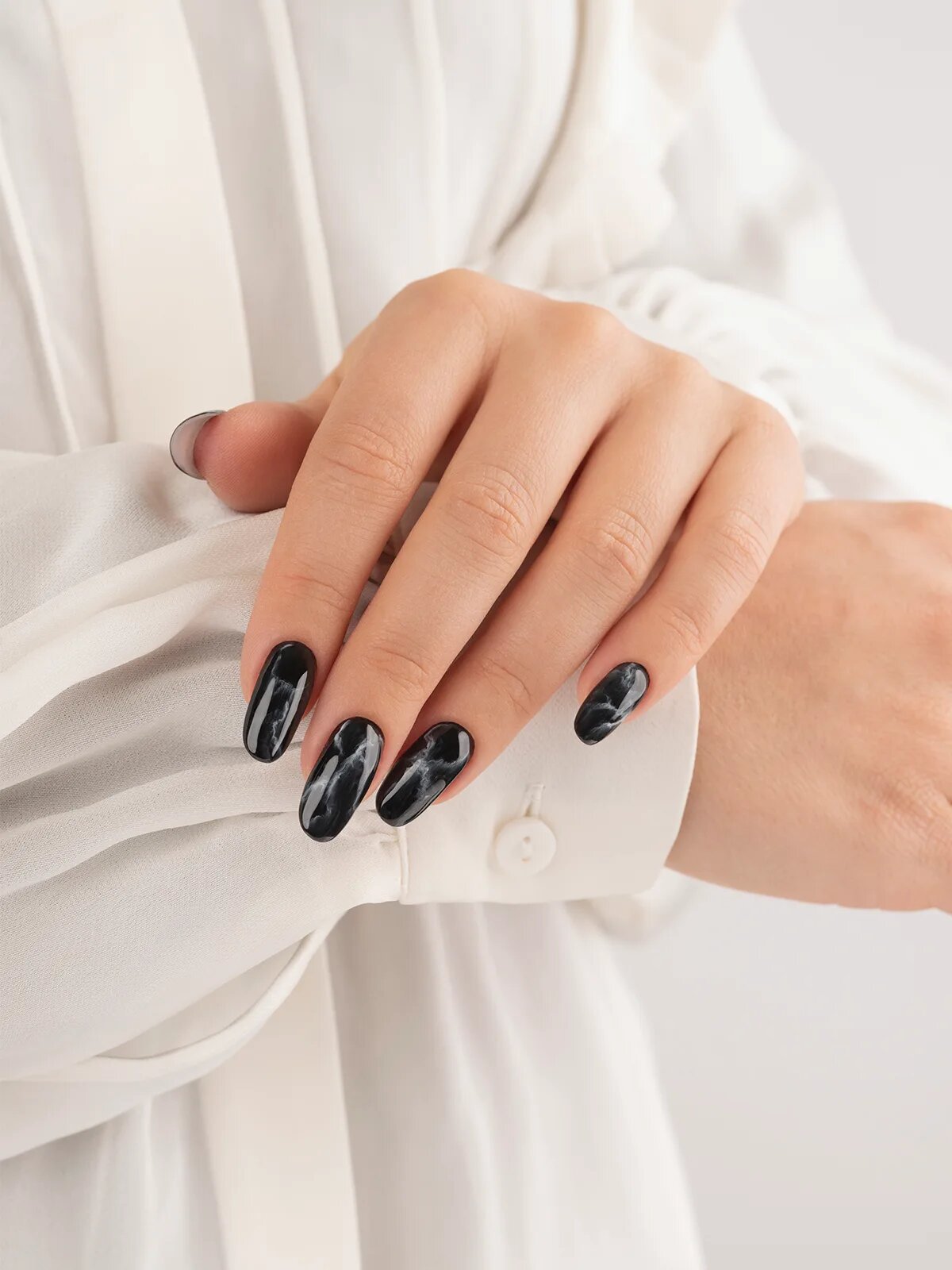 Se vuoi replicare la nuova manicure marmorizzata di Chiara Ferragni, adorerai l'accostamento della base nera con venature bianche!