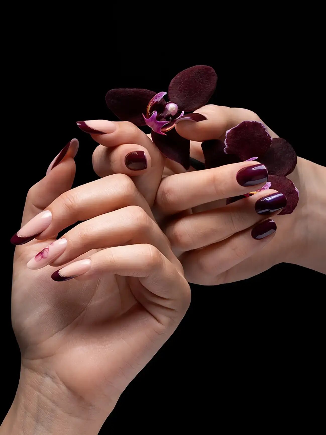 Lo stile mismatched si inserisce tra i protagonisti del mondo nails. Ogni unghia sfoggia una nuance diversa pur restando nella palette autunnale: viola, ciliegia, rosa antico, bordeaux e lilla. Più scuri ma accesi.