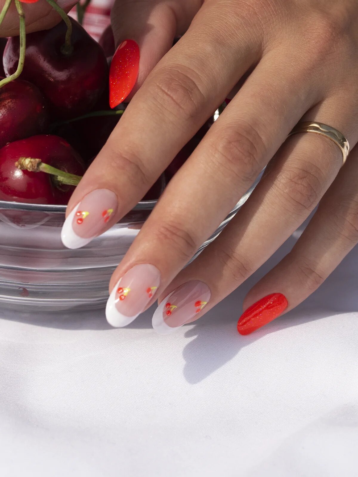 Le ciliegie possono essere un piccolo dettaglio su una manicure naturale, un accento vivace su un'unghia soltanto, o addirittura un'esplosione di frutta con ciliegie sparse ovunque. E che dire delle ciliegie fatte con pietre preziose o in 3D? Sono incredibili!