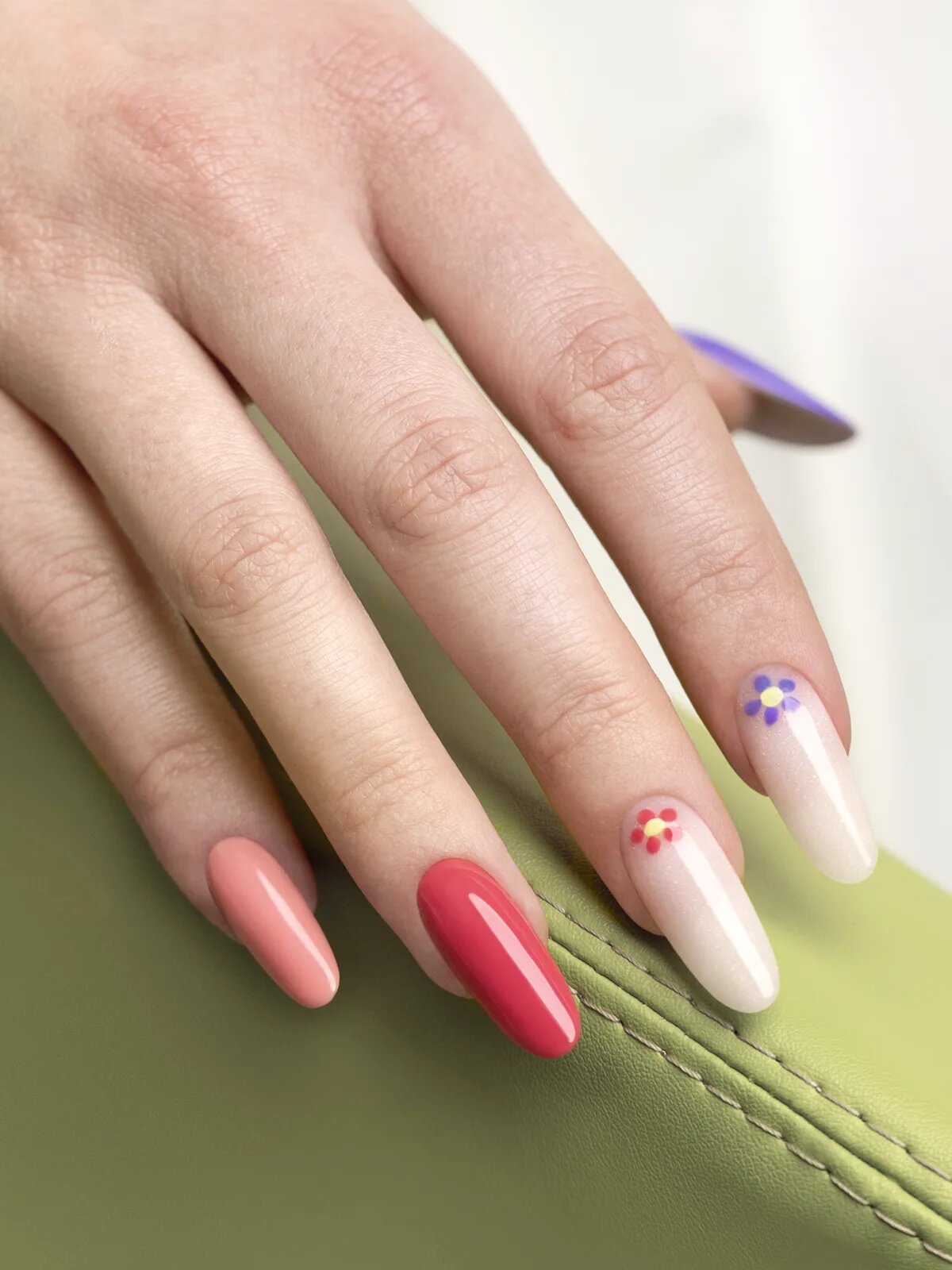 Il tema floreale potrebbe non essere innovativo, ma offre un rinfrescante cambio di stile verso la primavera. Un rosso acceso e piccoli strass al centro del fiore sono un ottimo esempio di unghie con fiori, facile e molto naturale.
